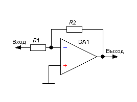 Знак минус в формуле расчета инвертирующего усилителя говорит о том, что фаза выходного сигнала «зеркальна» фазе входного.