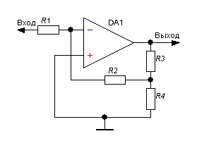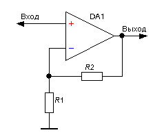 Схема неинвертирующего усилителя характеризуется бесконечно большим входным, и бесконечно малым выходным сопротивлением, что является её несомненным достоинством.